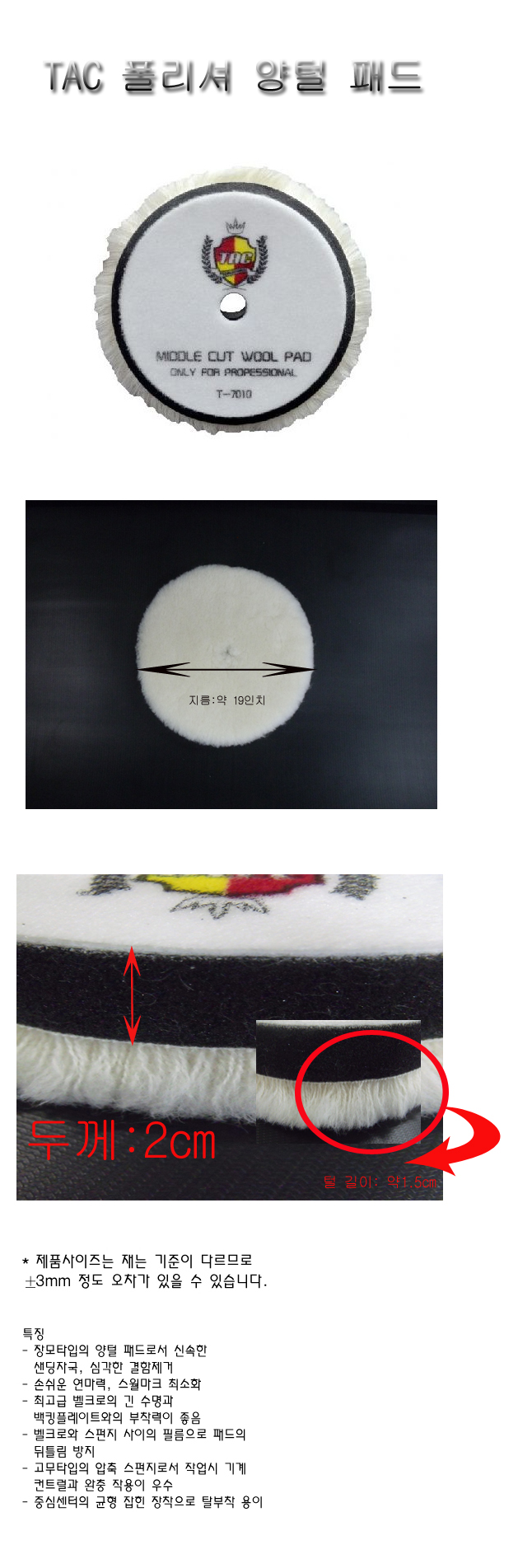 두께 2cm정도이고 장모타입의 양털 패드로 손쉬운 연마력과 스월마크를 최소화 시켜줌